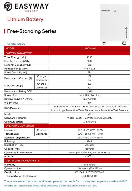 Thông số kỹ thuật của Lithium baterry Easyway UNIV-16kWh 51.2V314Ah